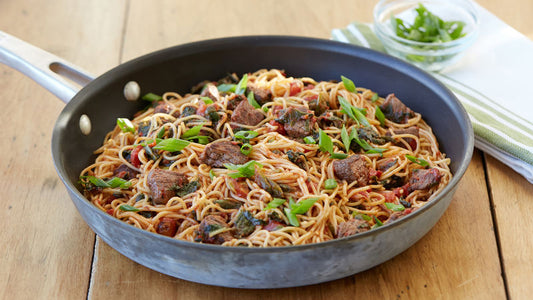 Steak sauté aux tomates sur des nouilles