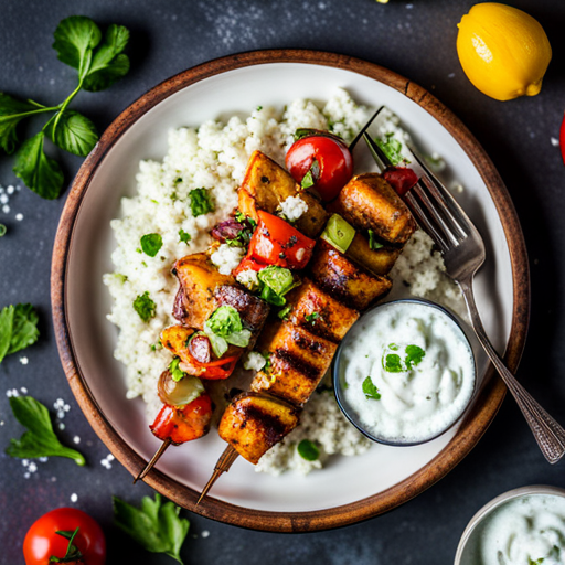 Souvlaki de poulet accompagné de riz de chou-fleur et de sauce tzatziki